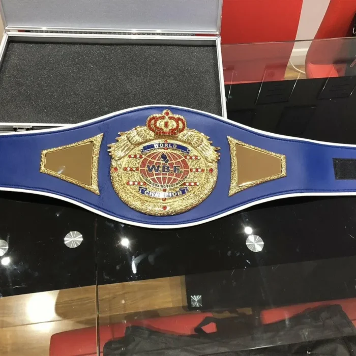We make boxing championship belts for WWE, MMA, and WWF using any requested specifications. This beautiful Boxing championship belt is made with brass metal plates. It has gold polished plates and a high-quality paint job on the metal plates of the WBF Boxing Championship belt. Pro Championship Belts handcrafts their own belts, including this one. The Leather straps used for this championship belt are real cow hide. We manufacture all sorts of boxing championship belts such as WWE, MMA and WWF . Unlike the previous belts which were only used for hanging clothes in the house, these ones are worn by people who love sport.”